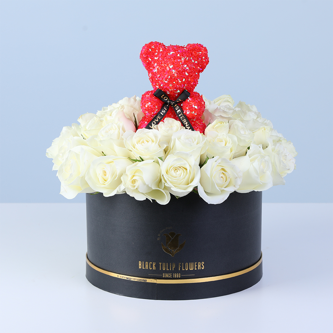 White Rose Flower Box with Red Teddy