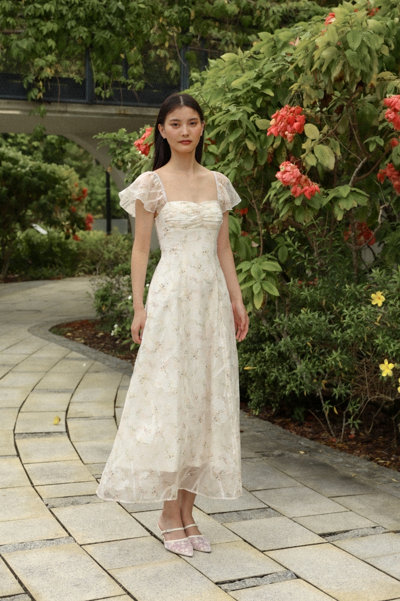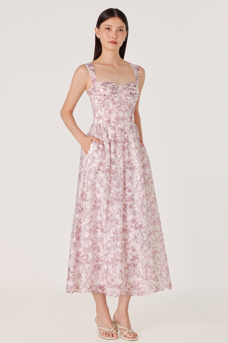 LILLIAN PADDED FLORAL ORGANZA RUCHED CORSET MIDAXI DRESS