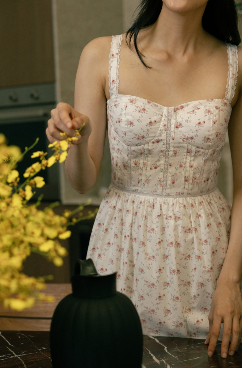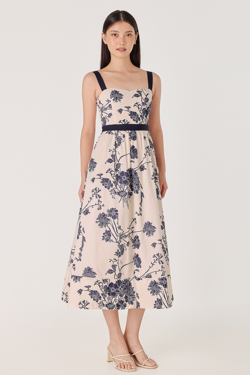 ROSELIA PADDED FLORAL LINEN CONTRAST PIPING MIDAXI DRESS