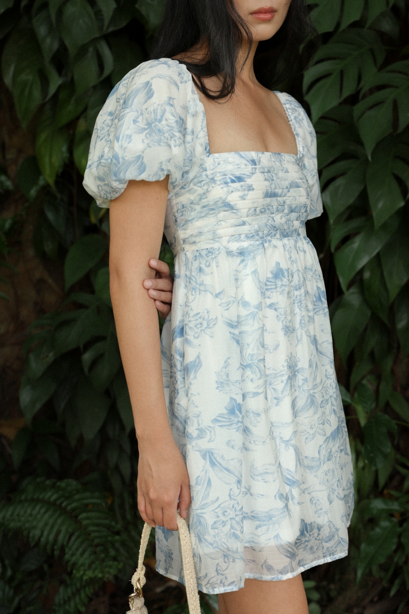 BOTANICAL PADDED FLORAL PLEATED BUBBLE SLEEVE BABYDOLL SKORTS DRESS