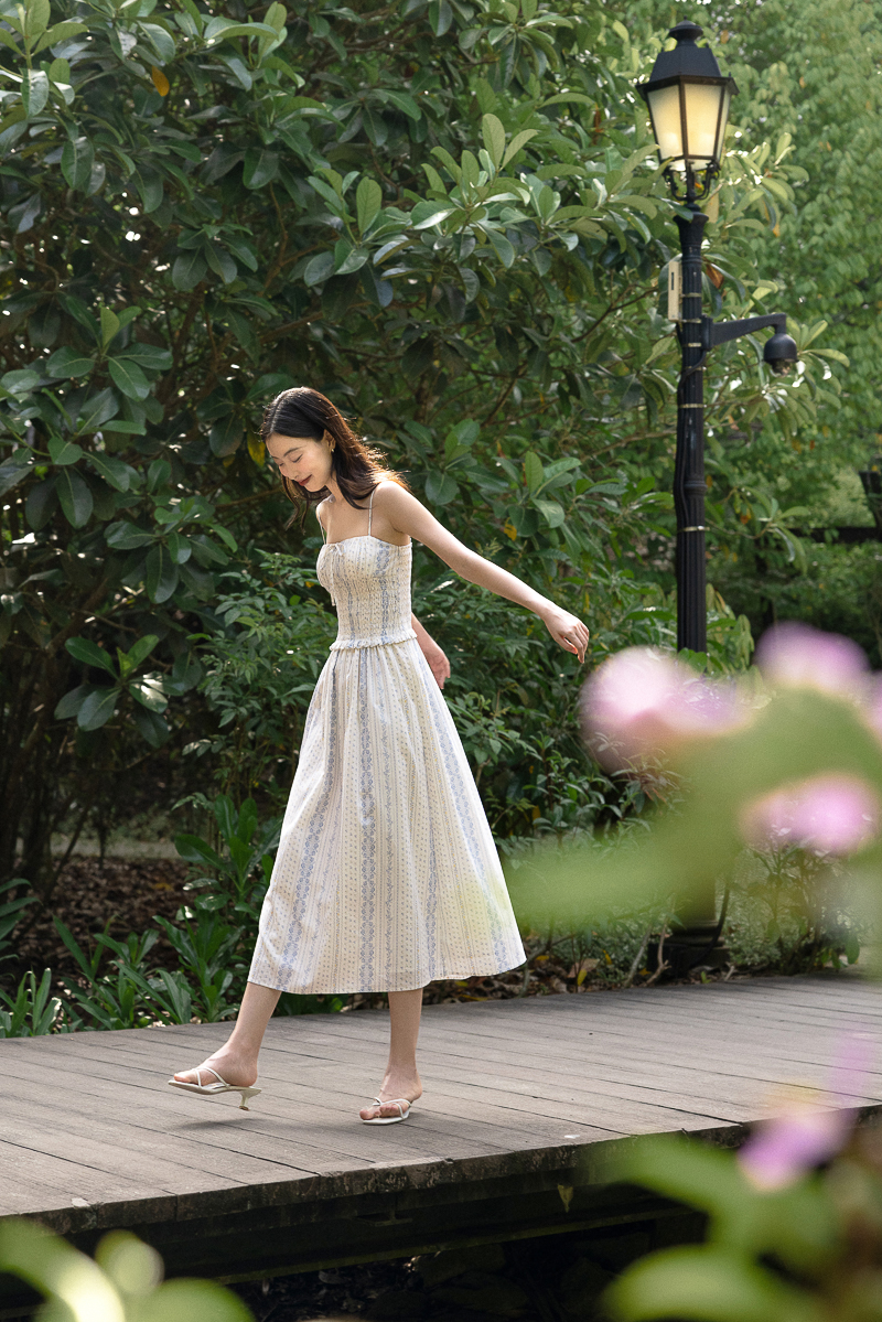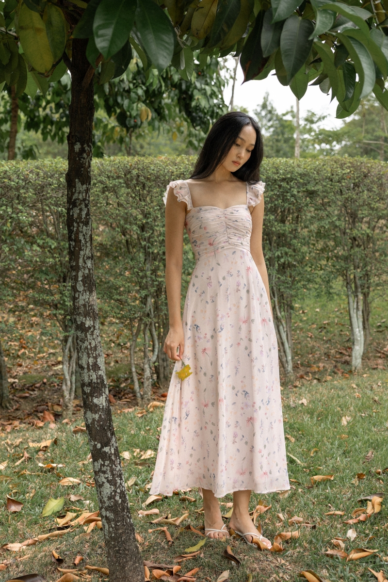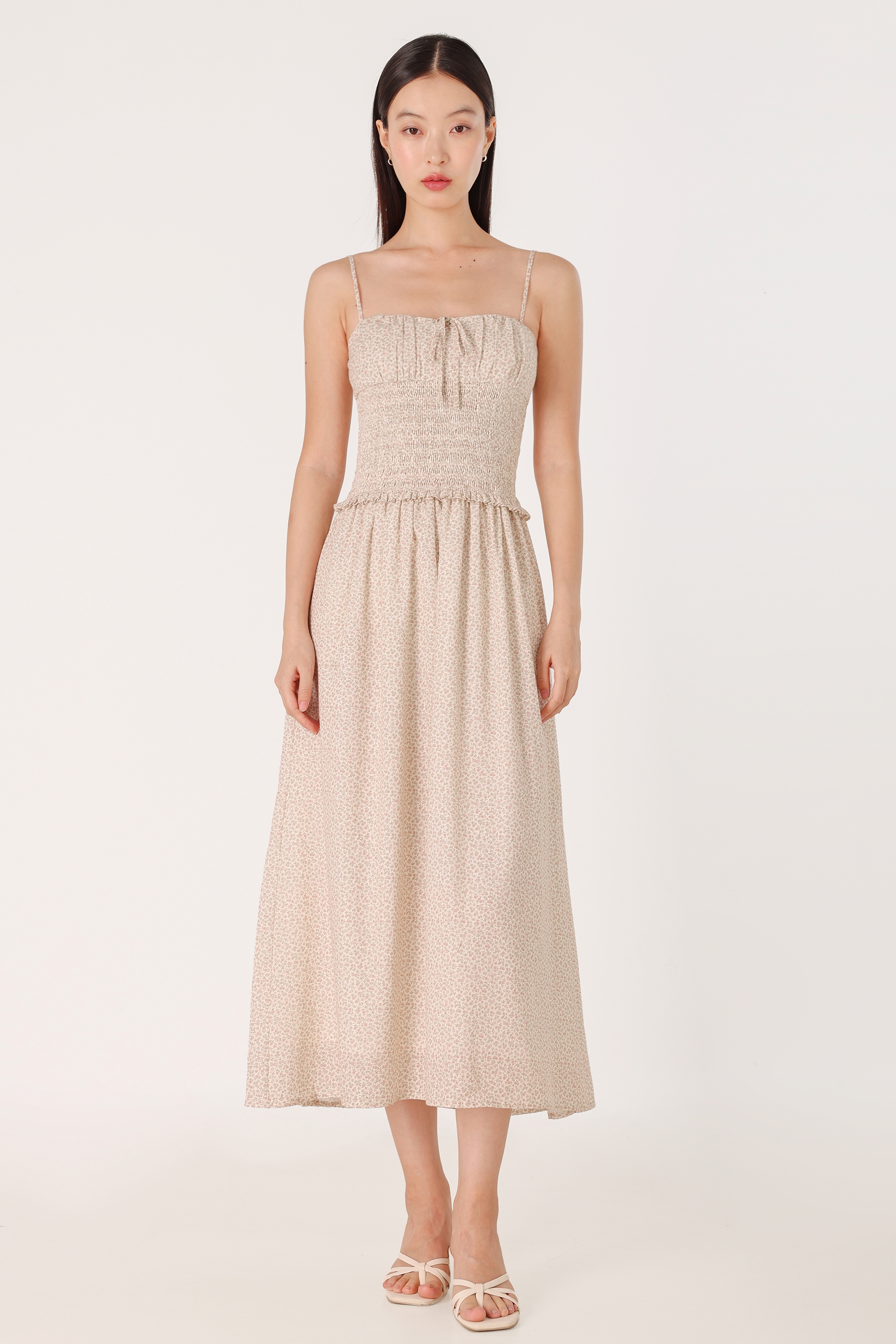 VIOLETTE PADDED SMOCKED WAIST RIBBON MIDAXI DRESS (FLORAL)