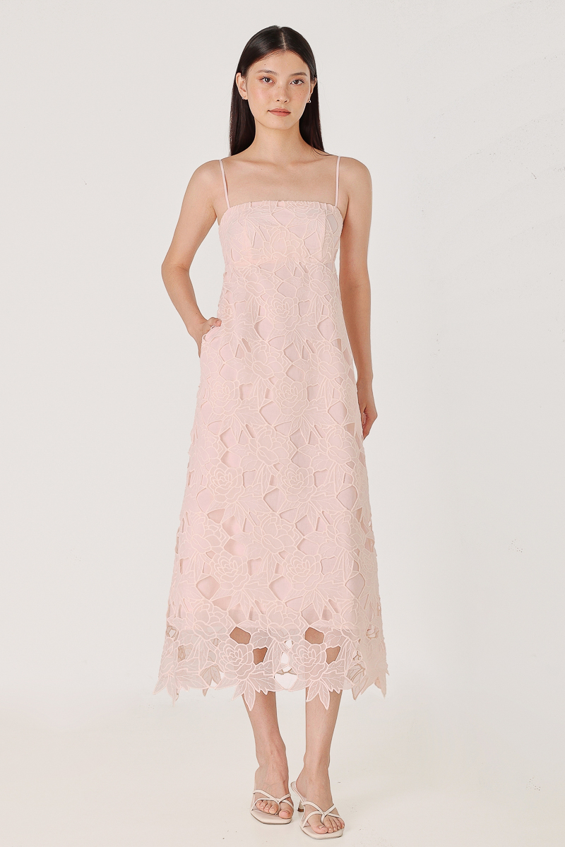CLARINA PADDED FLORAL EYELET LACE BABYDOLL MIDAXI DRESS (PINK)