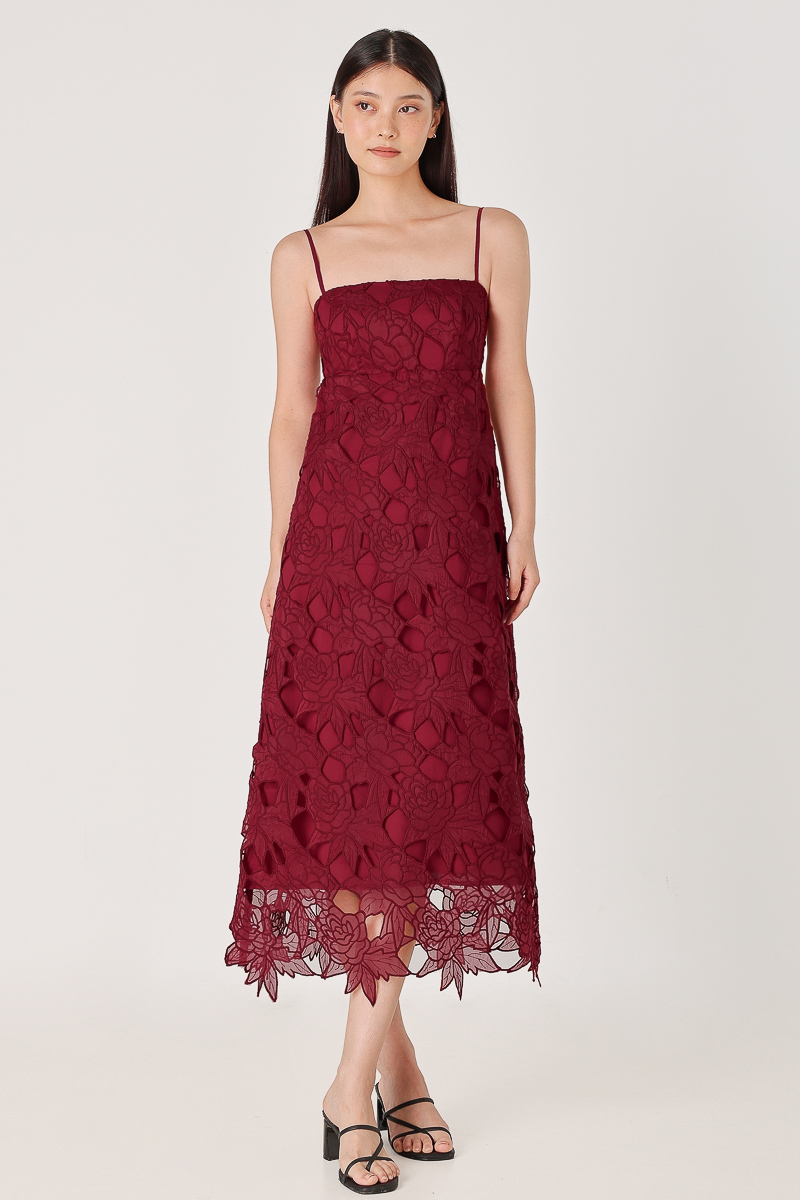 CLARINA PADDED FLORAL EYELET LACE BABYDOLL MIDAXI DRESS (WINE)