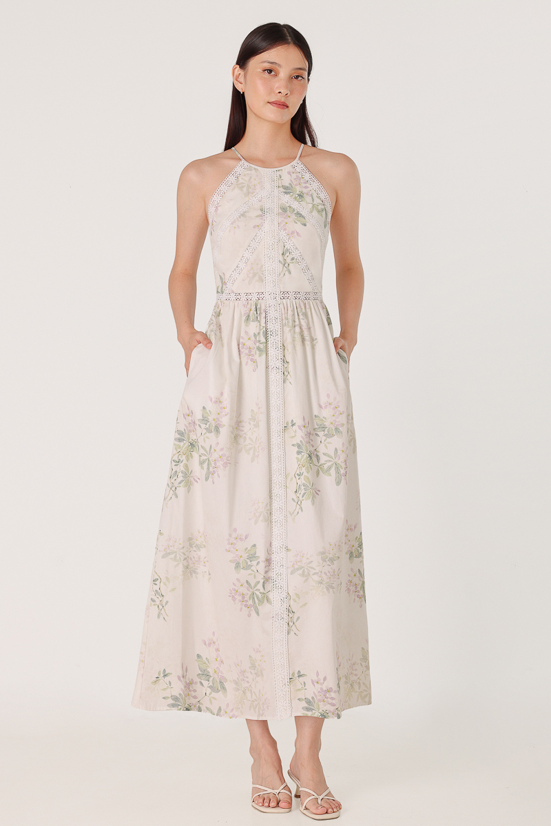 ACACIA PADDED FLORAL LACE INSERT HALTER MAXI DRESS