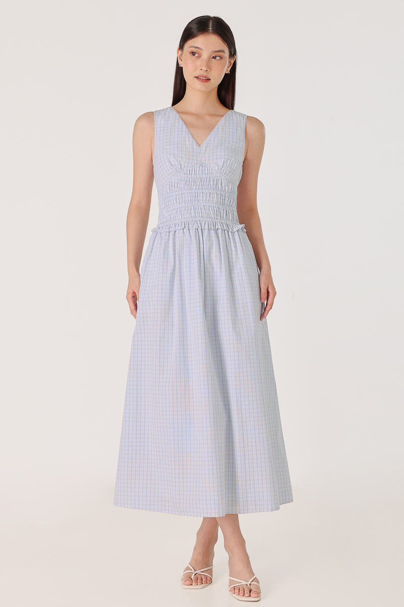 MIRA CHECKERED V-NECK EYELET TRIM MAXI DRESS