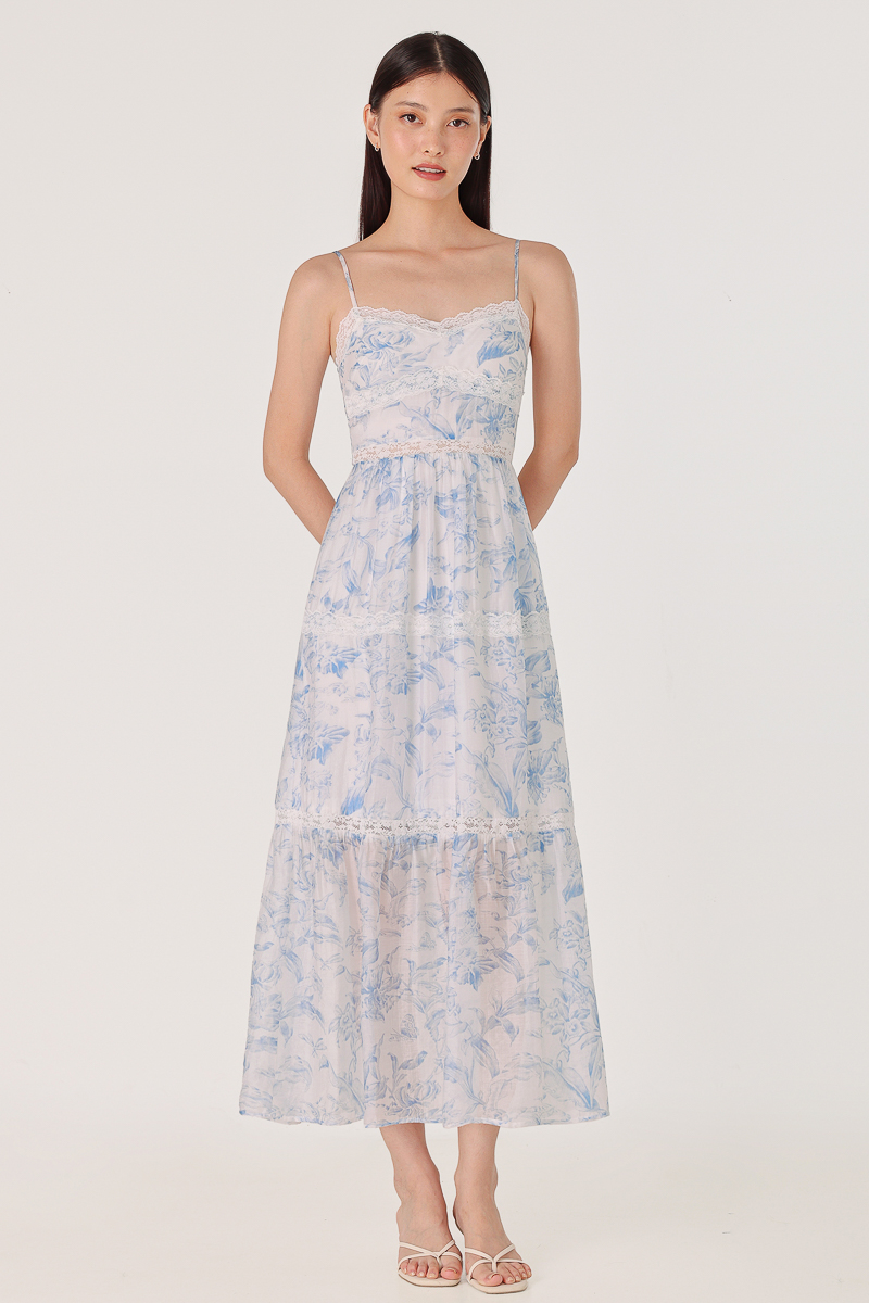 BOTANICAL PADDED FLORAL LACE TRIM TIERED MIDAXI DRESS