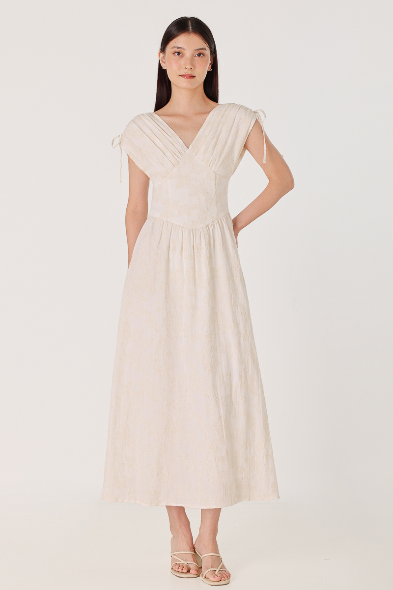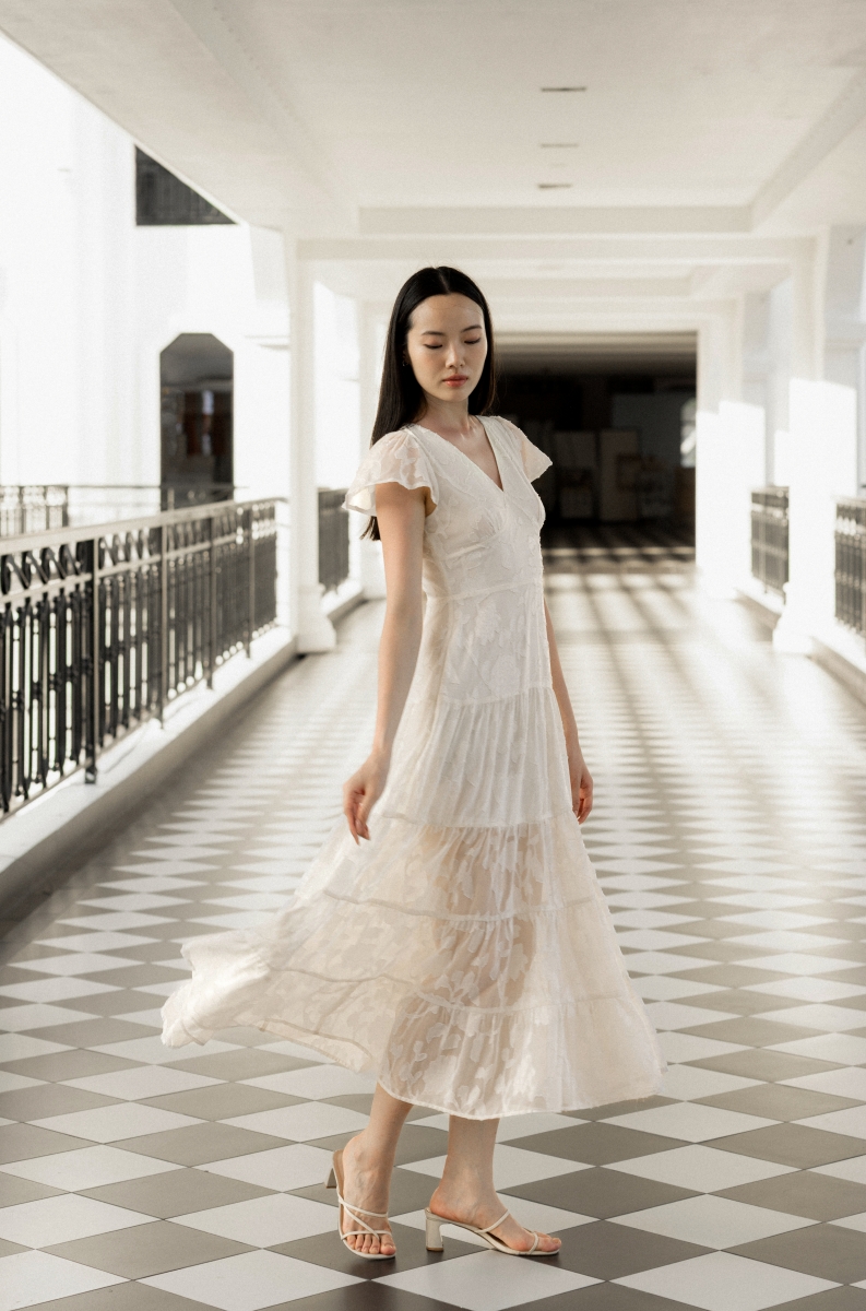 ADORIA FLORAL JACQUARD CHIFFON FLUTTER SLEEVE MAXI DRESS