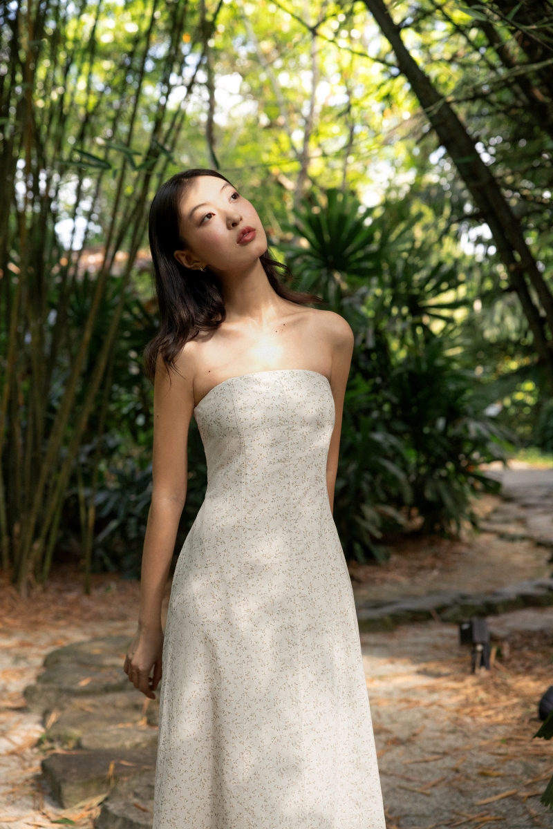 REIKO FLORAL JACQUARD DRAWSTRING CORSET MAXI DRESS