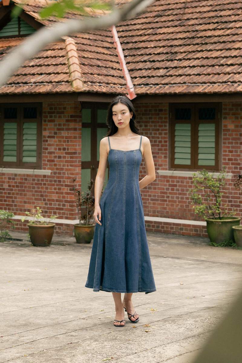 GOOD GRACE PANEL FLARE DENIM MIDAXI DRESS