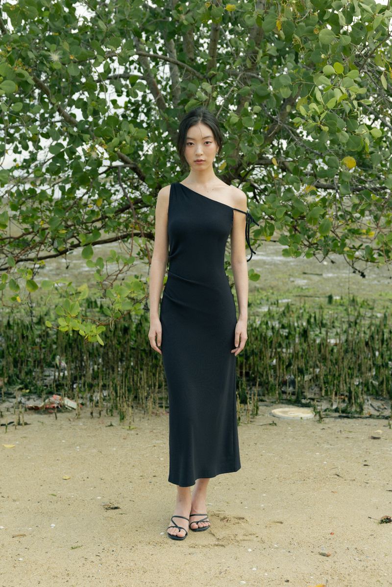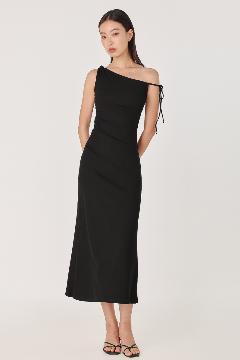 JAYLEA PADDED OFF-SHOULDER RIBBON RIBBED MAXI DRESS (BLACK)