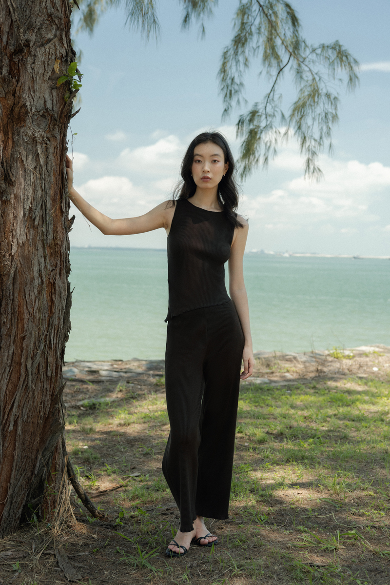 MARLOWE RIBBED LETTUCE HEM STRAIGHT LEG PANTS - REGULAR (BLACK)